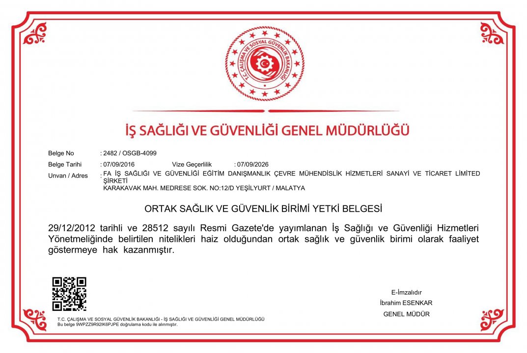 T.C. Çalışma ve Sosyal Güvenlik Bakanlığı İş Sağlığı Güvenliği Genel Müdürlüğü Tarafından verilen, Ortak Sağlık ve Güvenlik Birimi Yetki Belgemiz